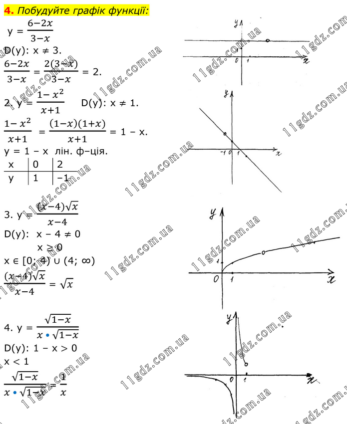 Побудуйте графік функції: y = (6-2x)/(3-x) D(y): x ≠ 3. (6-2x)/(3-x) = (2(3-x))/(3-x) = 2. 2. y = (1- x^2)/(x+1) D(y): x ≠ 1. (1- x^2)/(x+1) = ((1-x)(1+x))/(x+1) = 1 – x. y = 1 – x лін. ф–ція. х 0 2 у 1 –1 3. у = ((x-4)√x)/(x-4) D(y): x – 4 ≠ 0 x ≥ 0 x ∈ [0; 4) ∪ (4; ∞) ((x-4)√x)/(x-4) = √x 4. y = √(1-x)/(x • √(1-x)) D(y): 1 – x > 0 x < 1 √(1-x)/(x • √(1-x)) = 1/x