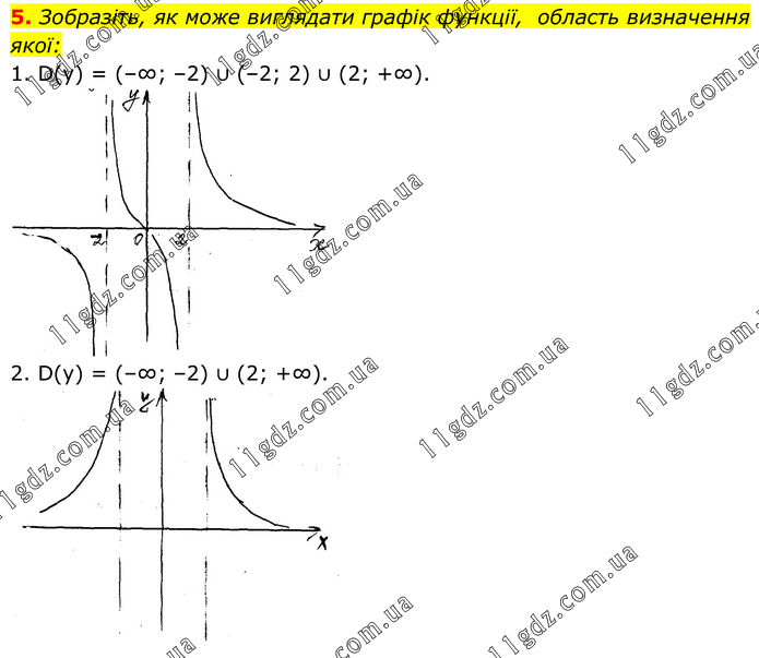 Зобразіть, як може виглядати графік функції, область визначення якої: 1. D(y) = (–∞; –2) ∪ (–2; 2) ∪ (2; +∞). 2. D(y) = (–∞; –2) ∪ (2; +∞).