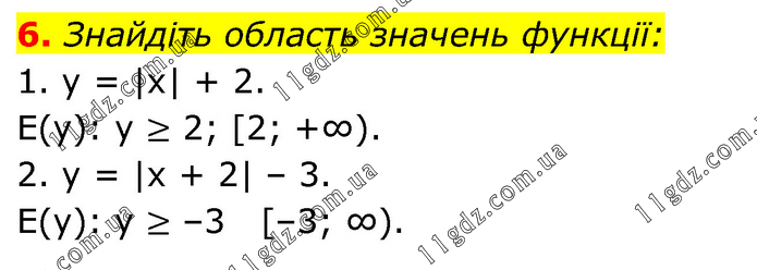 Знайдіть область значень функції: 1. y = |x| + 2. E(y): y ≥ 2; [2; +∞). 2. y = |x + 2| – 3. E(y): y ≥ –3 [–3; ∞).