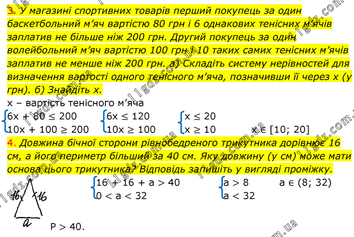 3. У магазині спортивних товарів перший покупець за один баскетбольний м’яч вартістю 80 грн і 6 однакових тенісних м’ячів заплатив не більше ніж 200 грн. Другий покупець за один волейбольний м’яч вартістю 100 грн і 10 таких самих тенісних м’ячів заплатив не менше ніж 200 грн. а) Складіть систему нерівностей для визначення вартості одного тенісного м’яча, позначивши її через x (у грн). б) Знайдіть x. х – вартість тенісного м’яча 6х + 80 ≤ 200 10х + 100 ≥ 200 6х ≤ 120 10х ≥ 100 х ≤ 20 х ≥ 10 х ∈ [10; 20] 4. Довжина бічної сторони рівнобедреного трикутника дорівнює 16 см, а його периметр більший за 40 см. Яку довжину (у см) може мати основа цього трикутника? Відповідь запишіть у вигляді проміжку. P > 40. 16 + 16 + a > 40 0 < a < 32 a > 8 a < 32 a ∈ (8; 32)