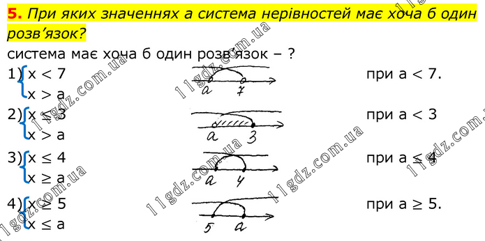 При яких значеннях а система нерівностей має хоча б один розв’язок? система має хоча б один розв’язок – ? 1) х < 7 х > а при а < 7. 2) х ≤ 3 х > а при а < 3 3) х ≤ 4 х ≥ а при а ≤ 4 4) х ≥ 5 х ≤ а при а ≥ 5.