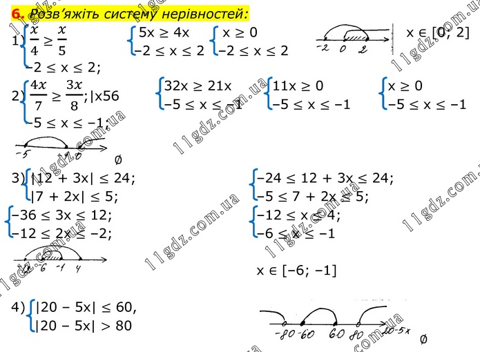 Розв’яжіть систему нерівностей: 1) x/4 ≥ x/5 –2 ≤ x ≤ 2; 5x ≥ 4x –2 ≤ x ≤ 2 x ≥ 0 –2 ≤ x ≤ 2 x ∈ [0; 2] 2) 4x/7 ≥ 3x/8;|x56 –5 ≤ x ≤ –1; 32x ≥ 21x –5 ≤ x ≤ –1 11x ≥ 0 –5 ≤ x ≤ –1 x ≥ 0 –5 ≤ x ≤ –1 ∅ 3) |12 + 3x| ≤ 24; |7 + 2x| ≤ 5; –24 ≤ 12 + 3x ≤ 24; –5 ≤ 7 + 2x ≤ 5; –36 ≤ 3x ≤ 12; –12 ≤ 2x ≤ –2; –12 ≤ x ≤ 4; –6 ≤ x ≤ –1 x ∈ [–6; –1] 4) |20 – 5x| ≤ 60, |20 – 5x| > 80 ∅