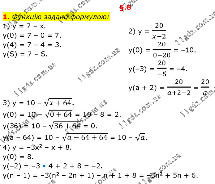 Функцію задано формулою: 1) y = 7 – x. y(0) = 7 – 0 = 7. y(4) = 7 – 4 = 3. y(S) = 7 – S. 2) y = 20/(x-2) y(0) = 20/(0-20) = –10. y(–3) = 20/(-5) = –4. y(a + 2) = 20/(a+2-2) = 20/a 3) y = 10 – √(x+64). y(0) = 10 – √(0+64) = 10 – 8 = 2. y(36) = 10 – √(36+64) = 0. y(a – 64) = 10 – √(a-64+64) = 10 – √a. 4) y = –3x2 – x + 8. y(0) = 8. y(–2) = –3 • 4 + 2 + 8 = –2. y(n – 1) = –3(n2 – 2n + 1) – n + 1 + 8 = –3n2 + 5n + 6.
