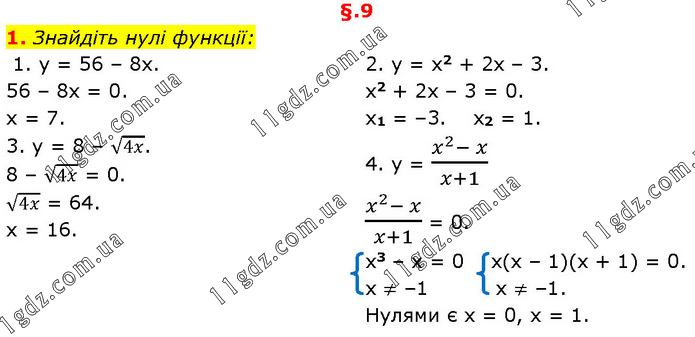 Знайдіть нулі функції: 1. y = 56 – 8x. 56 – 8x = 0. x = 7. 2. y = x2 + 2x – 3. x2 + 2x – 3 = 0. x1 = –3. x2 = 1. 3. y = 8 – √4x. 8 – √4x = 0. √4x = 64. x = 16. 4. y = (x^2- x)/(x+1) (x^2- x)/(x+1) = 0. x3 – x = 0 x(x – 1)(x + 1) = 0. x ≠ –1 x ≠ –1. Нулями є х = 0, х = 1.
