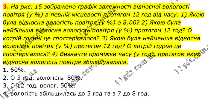 На рис. 15 зображено графік залежності відносної вологості повітря (у %) в певній місцевості протягом 12 год від часу. 1) Якою була відносна вологість повітря (у %) о 8:00? 2) Якою була найбільша відносна вологість повітря (у %) протягом 12 год? О котрій годині це спостерігалося? 3) Якою була найменша відносна вологість повітря (у %) протягом 12 год? О котрій годині це спостерігалося? 4) Визначте проміжки часу (у год), протягом яких відносна вологість повітря збільшувалася. 1. 60%. 2. О 3 год. вологість 80%. 3. О 12 год. волог. 50%. 4. вологість збільшилась до 3 год та з 7 до 8 год.