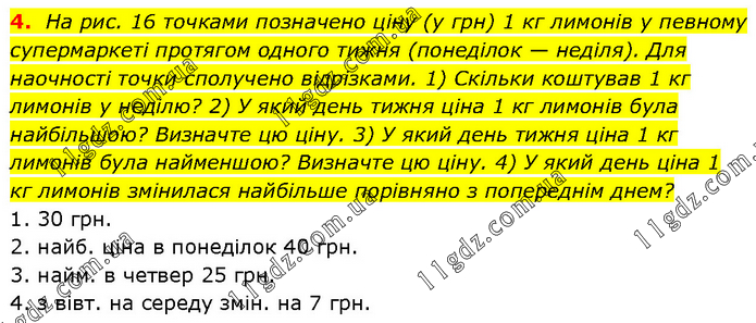 На рис. 16 точками позначено ціну (у грн) 1 кг лимонів у певному супермаркеті протягом одного тижня (понеділок — неділя). Для наочності точки сполучено відрізками. 1) Скільки коштував 1 кг лимонів у неділю? 2) У який день тижня ціна 1 кг лимонів була найбільшою? Визначте цю ціну. 3) У який день тижня ціна 1 кг лимонів була найменшою? Визначте цю ціну. 4) У який день ціна 1 кг лимонів змінилася найбільше порівняно з попереднім днем? 1. 30 грн. 2. найб. ціна в понеділок 40 грн. 3. найм. в четвер 25 грн. 4. з вівт. на середу змін. на 7 грн.