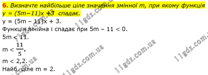 Визначте найбільше ціле значення змінної m, при якому функція y = (5m−11)x +3 спадає. у = (5m – 11)x + 3. Функція лінійна і спадає при 5m – 11 < 0. 5m < 11. m < 11/5. m < 2,2. Найб. ціле m = 2.