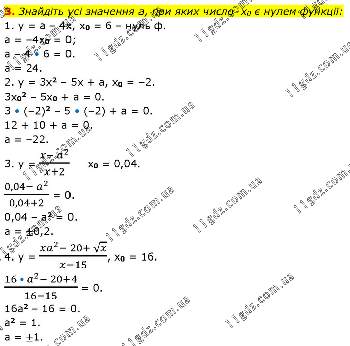 Знайдіть усі значення a, при яких число x0 є нулем функції: 1. y = a – 4x, x0 = 6 – нуль ф. а = –4х0 = 0; а – 4 • 6 = 0. а = 24. 2. y = 3x2 – 5x + a, x0 = –2. 3x02 – 5x0 + a = 0. 3 • (–2)2 – 5 • (–2) + a = 0. 12 + 10 + a = 0. a = –22. 3. y = (x- a^2)/(x+2) x0 = 0,04. (0,04- a^2)/(0,04+2) = 0. 0,04 – a2 = 0. a = ±0,2. 4. y = (xa^2- 20+ √x)/(x-15), x0 = 16. (16 • a^2- 20+4)/(16-15) = 0. 16a2 – 16 = 0. a2 = 1. a = ±1.