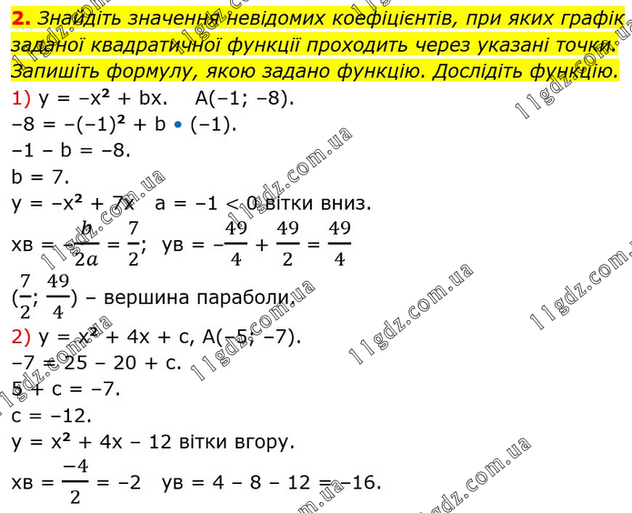 Знайдіть значення невідомих коефіцієнтів, при яких графік заданої квадратичної функції проходить через указані точки. Запишіть формулу, якою задано функцію. Дослідіть функцію. 1) y = –x2 + bx. A(–1; –8). –8 = –(–1)2 + b • (–1). –1 – b = –8. b = 7. y = –x2 + 7x a = –1 < 0 вітки вниз. хв = –b/2a = 7/2; ув = –49/4 + 49/2 = 49/4 (7/2; 49/4) – вершина параболи. 2) у = х2 + 4х + с, А(–5; –7). –7 = 25 – 20 + с. 5 + с = –7. с = –12. у = х2 + 4х – 12 вітки вгору. хв = (-4)/2 = –2 ув = 4 – 8 – 12 = –16.
