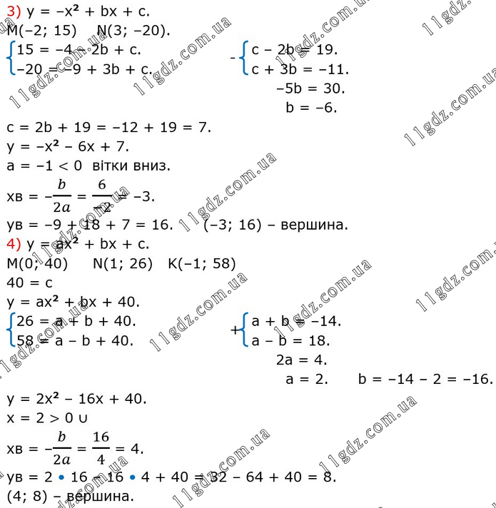 3) у = –х2 + bx + c. M(–2; 15) N(3; –20). 15 = –4 – 2b + c. –20 = –9 + 3b + c. c – 2b = 19. c + 3b = –11. –5b = 30. b = –6. c = 2b + 19 = –12 + 19 = 7. y = –x2 – 6x + 7. a = –1 < 0 вітки вниз. хв = –b/2a = 6/(-2) = –3. ув = –9 + 18 + 7 = 16. (–3; 16) – вершина. 4) у = ах2 + bx + c. M(0; 40) N(1; 26) K(–1; 58) 40 = c y = ax2 + bx + 40. 26 = a + b + 40. 58 = a – b + 40. a + b = –14. a – b = 18. 2a = 4. a = 2. b = –14 – 2 = –16. y = 2x2 – 16x + 40. x = 2 > 0 ∪ хв = –b/2a = 16/4 = 4. ув = 2 • 16 – 16 • 4 + 40 = 32 – 64 + 40 = 8. (4; 8) – вершина.