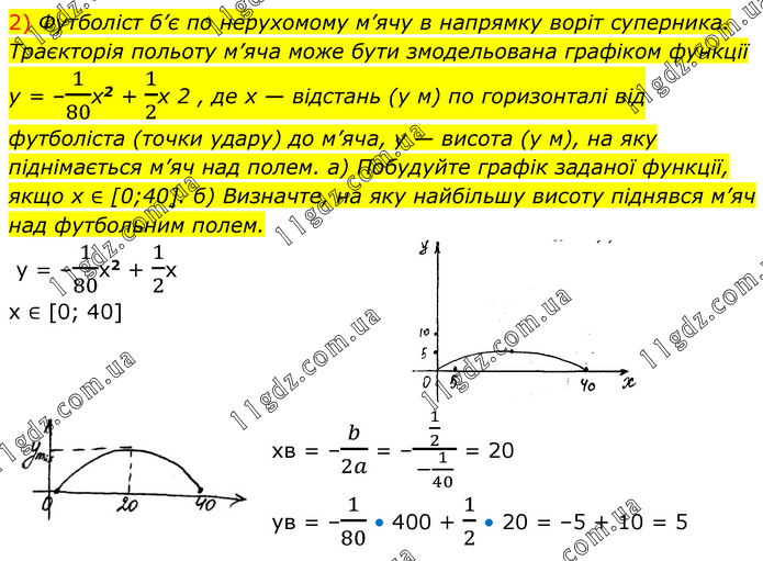 Футболіст б’є по нерухомому м’ячу в напрямку воріт суперника. Траєкторія польоту м’яча може бути змодельована графіком функції y = –1/80x2 + 1/2x 2 , де х — відстань (у м) по горизонталі від футболіста (точки удару) до м’яча, у — висота (у м), на яку піднімається м’яч над полем. а) Побудуйте графік заданої функції, якщо x¬ ∈ [0;40]. б) Визначте, на яку найбільшу висоту піднявся м’яч над футбольним полем. y = –1/80x2 + 1/2x x ∈ [0; 40] хв = –b/2a = –(1/2)/(-1/40) = 20 ув = –1/80 • 400 + 1/2 • 20 = –5 + 10 = 5