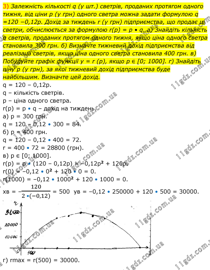 Залежність кількості q (у шт.) светрів, проданих протягом одного тижня, від ціни p (у грн) одного светра можна задати формулою q =120 −0,12p. Дохід за тиждень r (у грн) підприємства, що продає ці светри, обчислюється за формулою r(p) = p • q. а) Знайдіть кількість q светрів, проданих протягом одного тижня, якщо ціна одного светра становила 300 грн. б) Визначте тижневий дохід підприємства від реалізації светрів, якщо ціна одного светра становила 400 грн. в) Побудуйте графік функції y = r (p), якщо p¬ ∈ [0; 1000]. г) Знайдіть ціну p (у грн), за якої тижневий дохід підприємства буде найбільшим. Визначте цей дохід. q = 120 – 0,12p. q – кількість светрів. р – ціна одного светра. r(p) = p • q – дохід на тиждень. а) р = 300 грн. q = 120 – 0,12 • 300 = 84. б) р = 400 грн. q = 120 – 0,12 • 400 = 72. r = 400 • 72 = 28800 (грн). в) p ∈ [0; 1000]. r(p) = p • (120 – 0,12p) = –0,12p2 + 120p. r(0) = –0,12 • 02 + 120 • 0 = 0. r(1000) = –0,12 • 10002 + 120 • 1000 = 0. хв = –120/(2 •(-0,12)) = 500 ув = –0,12 • 250000 + 120 • 500 = 30000. г) rmax = r(500) = 30000.
