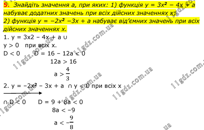 Знайдіть значення а, при яких: 1) функція y = 3x2 − 4x + a набуває додатних значень при всіх дійсних значеннях x; 2) функція y = −2x2 −3x + a набуває від’ємних значень при всіх дійсних значеннях x. 1. y = 3x2 – 4x + a ∪ y > 0 при всіх х. D < 0 D = 16 – 12а < 0 12а > 16 а > 4/3 2. у = –2х2 – 3х + а ∩ у < 0 при всіх х ∩ D < 0 D = 9 + 8a < 0 8a < –9 a < –9/8