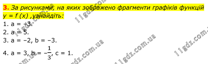 За рисунками, на яких зображено фрагменти графіків функцій y = f (x) ,yзнайдіть: 1. a = –3. 2. a = 5. 3. a = –2, b = –3. 4. a = 3, b = –1/3, c = 1.
