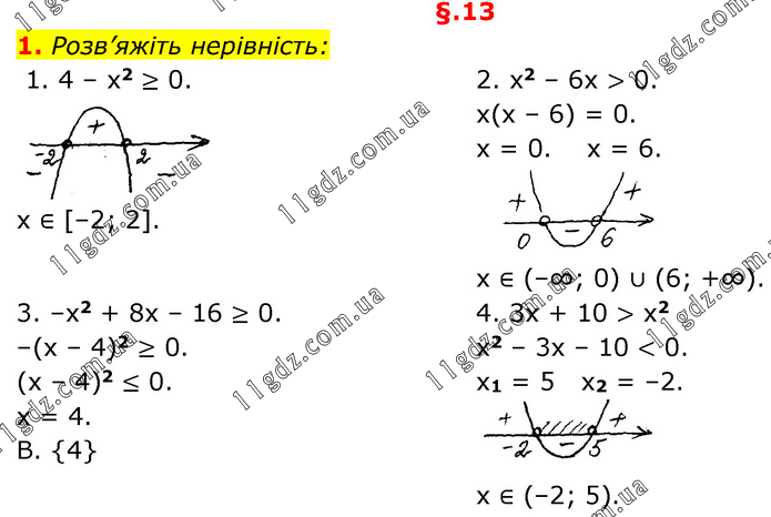 Розв’яжіть нерівність: 1. 4 – x2 ≥ 0. x ∈ [–2; 2]. 2. x2 – 6x > 0. x(x – 6) = 0. x = 0. x = 6. x ∈ (–∞; 0) ∪ (6; +∞). 3. –x2 + 8x – 16 ≥ 0. –(x – 4)2 ≥ 0. (x – 4)2 ≤ 0. x = 4. B. {4} 4. 3x + 10 > x2 x2 – 3x – 10 < 0. x1 = 5 x2 = –2. x ∈ (–2; 5).