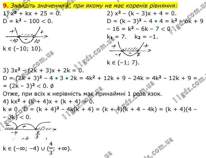 Знайдіть значення k, при якому не має коренів рівняння: 1) x2 + kx + 25 = 0. D = k2 – 100 < 0. k ∈ (–10; 10). 2) x2 – (k – 3)x + 4 = 0. D = (k – 3)2 – 4 • 4 = k2 – 6k + 9 – 16 = k2 – 6k – 7 < 0. k1 = 7. k2 = –1. k ∈ (–1; 7). 3) 3x2 – (2k + 3)x + 2k = 0. D = (2k + 3)2 – 4 • 3 • 2k = 4k2 + 12k + 9 – 24k = 4k2 – 12k + 9 = = (2k – 3)2 < 0. ∅ Отже, при всіх к нерівність має принаймні 1 розв’язок. 4) kx2 + (k + 4)x + (k + 4) = 0. k ≠ 0 D = (k + 4)2 – 4k(k + 4) = (k + 4)(k + 4 – 4k) = (k + 4)(4 – – 3k) < 0. k ∈ (–∞; –4) ∪ (4/3; +∞).
