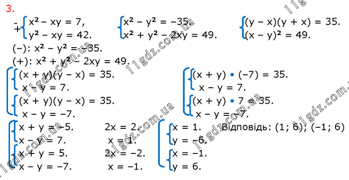 х2 – ху = 7, у2 – ху = 42. х2 – у2 = –35. х2 + у2 – 2ху = 49. (у – х)(у + х) = 35. (х – у)2 = 49. (–): х2 – у2 = –35. (+): х2 + у2 – 2ху = 49. (х + у)(у – х) = 35. х – у = 7. (х + у)(у – х) = 35. х – у = –7. (х + у) • (–7) = 35. х – у = 7. (х + у) • 7 = 35. х – у = –7. х + у = –5. х – у = 7. х + у = 5. х – у = –7. 2х = 2. х = 1. 2х = –2. х = –1. х = 1. у = –6. х = –1. у = 6. Відповідь: (1; 6); (–1; 6)