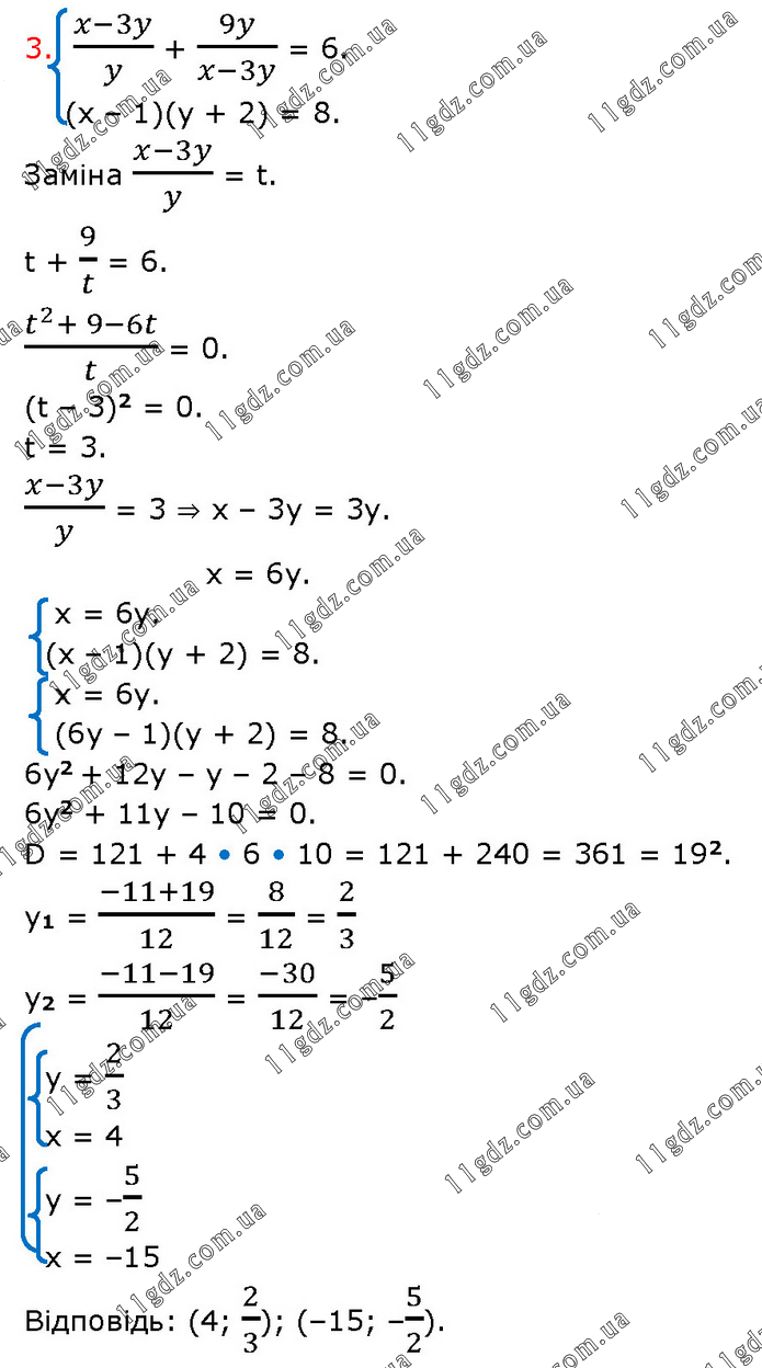 (x-3y)/y + 9y/(x-3y) = 6. (x – 1)(y + 2) = 8. Заміна (x-3y)/y = t. t + 9/t = 6. (t^2+ 9-6t)/t = 0. (t – 3)2 = 0. t = 3. (x-3y)/y = 3 ⇒ x – 3y = 3y. x = 6y. x = 6y. (x – 1)(y + 2) = 8. x = 6y. (6y – 1)(y + 2) = 8. 6y2 + 12y – y – 2 – 8 = 0. 6y2 + 11y – 10 = 0. D = 121 + 4 • 6 • 10 = 121 + 240 = 361 = 192. y1 = (-11+19)/12 = 8/12 = 2/3 y2 = (-11-19)/12 = (-30)/12 = –5/2 y = 2/3 x = 4 y = –5/2 x = –15 Відповідь: (4; 2/3); (–15; –5/2).