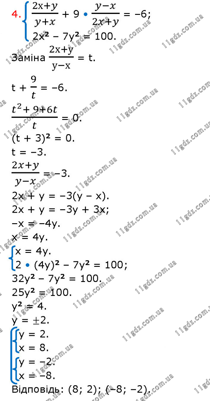 (2х+y)/(y+x) + 9 • (y-x)/(2x+y) = –6; 2x2 – 7y2 = 100. Заміна (2х+у)/(у-х) = t. t + 9/t = –6. (t^2+ 9+6t)/t = 0. (t + 3)2 = 0. t = –3. (2x+y)/(y-x) = –3. 2x + y = –3(y – x). 2x + y = –3y + 3x; –x = –4y. x = 4y. x = 4y. 2 • (4y)2 – 7y2 = 100; 32y2 – 7y2 = 100. 25y2 = 100. y2 = 4. y = ±2. y = 2. x = 8. y = –2. x = –8. Відповідь: (8; 2); (–8; –2).