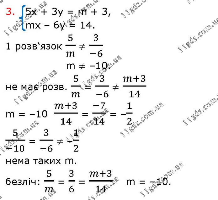 5х + 3у = m + 3, mx – 6y = 14. 1 розв‘язок 5/m ≠ 3/(-6) m ≠ –10. не має розв. 5/m = 3/(-6) ≠ (m+3)/14 m = –10 (m+3)/14 = (-7)/14 = –1/2 5/(-10) = 3/(-6) ≠ –1/2 нема таких m. безліч: 5/m = 3/6 = (m+3)/14 m = –10.
