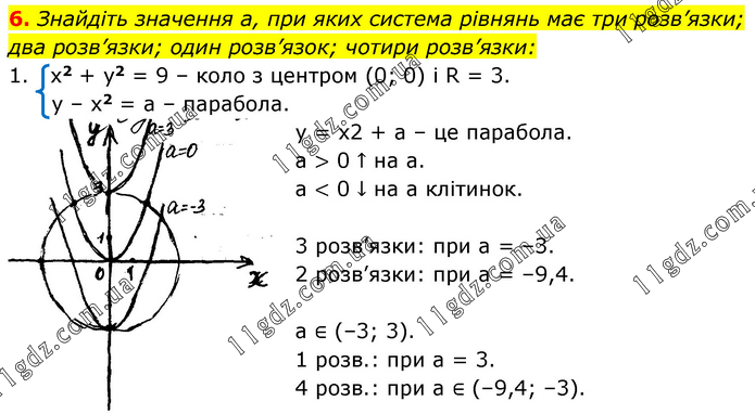 Знайдіть значення а, при яких система рівнянь має три розв’язки; два розв’язки; один розв’язок; чотири розв’язки: 1. x2 + y2 = 9 – коло з центром (0; 0) і R = 3. y – x2 = a – парабола. у = х2 + а – це парабола. а > 0 ↑ на а. а < 0 ↓ на а клітинок. 3 розв’язки: при а = –3. 2 розв’язки: при а = –9,4. а ∈ (–3; 3). 1 розв.: при а = 3. 4 розв.: при а ∈ (–9,4; –3).