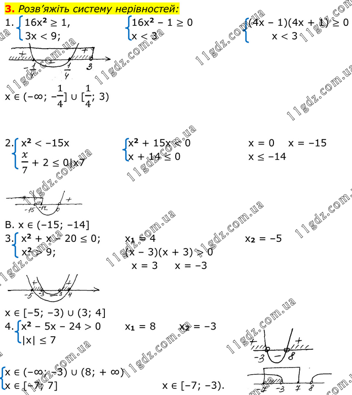 Розв’яжіть систему нерівностей: 1. 16x2 ≥ 1, 3x < 9; 16x2 – 1 ≥ 0 x < 3 (4x – 1)(4x + 1) ≥ 0 x < 3 x ∈ (–∞; –1/4] ∪ [1/4; 3) 2. x2 < –15x x/7 + 2 ≤ 0|x7 x2 + 15x < 0 x + 14 ≤ 0 x = 0 x = –15 x ≤ –14 B. x ∈ (–15; –14] 3. x2 + x – 20 ≤ 0; x2 > 9; x1 = 4 (x – 3)(x + 3) > 0 x = 3 x = –3 x2 = –5 x ∈ [–5; –3) ∪ (3; 4] 4. x2 – 5x – 24 > 0 |x| ≤ 7 x1 = 8 x2 = –3 x ∈ (–∞; –3) ∪ (8; + ∞) x ∈ [–7; 7] x ∈ [–7; –3).