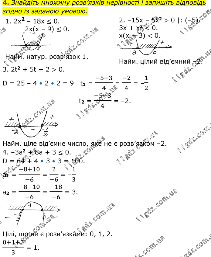 Знайдіть множину розв’язків нерівності і запишіть відповідь згідно із заданою умовою. 1. 2x2 – 18x ≤ 0. 2x(x – 9) ≤ 0. Найм. натур. розв’язок 1. 2. –15х – 5х2 > 0 |: (–5). 3x + x2 < 0. x(x + 3) < 0. Найм. цілий від’ємний –2. 3. 2t2 + 5t + 2 > 0. D = 25 – 4 • 2 • 2 = 9 t1 = (-5-3)/4 = (-2)/4 = –1/2 t2 = (-5-3)/4 = –2. Найм. ціле від’ємне число, яке не є розв’язком –2. 4. –3а2 + 8а + 3 ≤ 0. D = 64 + 4 • 3 • 3 = 100. a1 = (-8+10)/(-6) = 2/(-6) = –1/3 a2 = (-8-10)/(-6) = (-18)/(-6) = 3. Цілі, що не є розв’язками: 0, 1, 2. (0+1+2)/3 = 1.