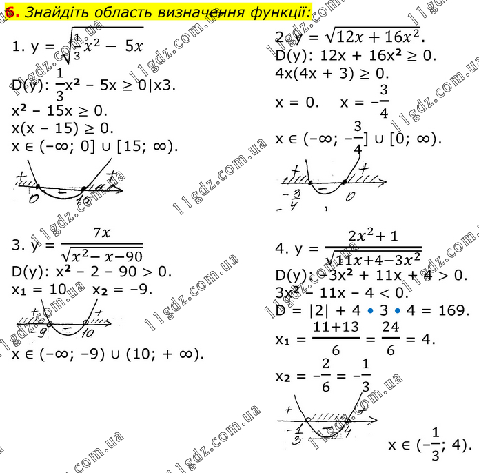 Знайдіть область визначення функції: 1. y = √(1/3 x^2- 5x) D(y): 1/3x2 – 5x ≥ 0|x3. x2 – 15x ≥ 0. x(x – 15) ≥ 0. x ∈ (–∞; 0] ∪ [15; ∞). 2. y = √(12x+16x^2 ). D(y): 12x + 16x2 ≥ 0. 4x(4x + 3) ≥ 0. x = 0. x = –3/4 x ∈ (–∞; –3/4] ∪ [0; ∞). 3. y = 7x/√(x^2- x-90) D(y): x2 – 2 – 90 > 0. x1 = 10 x2 = –9. x ∈ (–∞; –9) ∪ (10; + ∞). 4. y = (2x^2+ 1)/√(11x+4-3x^2 ) D(y): –3x2 + 11x + 4 > 0. 3x2 – 11x – 4 < 0. D = |2| + 4 • 3 • 4 = 169. x1 = (11+13)/6 = 24/6 = 4. x2 = –2/6 = –1/3 x ∈ (–1/3; 4).