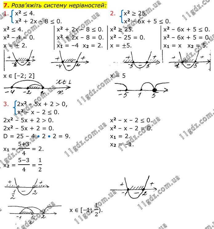 Розв’яжіть систему нерівностей: 1. x2 ≤ 4. x2 + 2x – 8 ≤ 0. 2. x2 ≥ 25. x2 – 6x + 5 ≤ 0. x2 ≤ 4. x2 – 4 = 0. x = ± 2. x2 + 2x – 8 ≤ 0. x2 + 2x – 8 = 0. x1 = –4 x2 = 2. x2 ≥ 25. x2 – 25 = 0. x = ±5. x2 – 6x + 5 ≤ 0. x2 – 6x + 5 = 0. x1 = x x2 = 5. x ∈ [–2; 2] x = 5 3. 2x2 – 5x + 2 > 0, x2 – x – 2 ≤ 0. 2x2 – 5x + 2 > 0. 2x2 – 5x + 2 = 0. D = 25 – 4 • 2 • 2 = 9. x1 = (5+3)/4 = 2. x2 = (5-3)/4 = 1/2 x2 – x – 2 ≤ 0. x2 – x – 2 = 0. x1 = 2. x2 = –1. x ∈ [–1; 1/2).