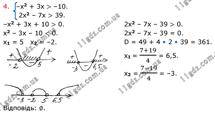 –x2 + 3x > –10. 2x2 – 7x > 39. –x2 + 3x + 10 > 0. x2 – 3x – 10 < 0. x1 = 5 x2 = –2. 2x2 – 7x – 39 > 0. 2x2 – 7x – 39 = 0. D = 49 + 4 • 2 • 39 = 361. x1 = (7+19)/4 = 6,5. x2 = (7-19)/4 = –3. Відповідь: ∅.