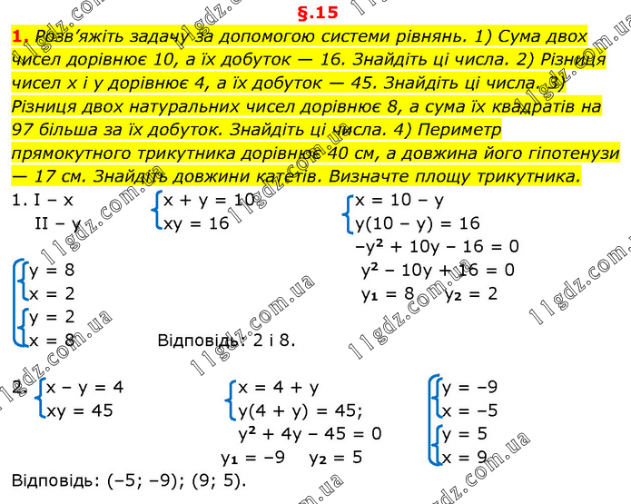 Розв’яжіть задачу за допомогою системи рівнянь. 1) Сума двох чисел дорівнює 10, а їх добуток — 16. Знайдіть ці числа. 2) Різниця чисел x і y дорівнює 4, а їх добуток — 45. Знайдіть ці числа. 3) Різниця двох натуральних чисел дорівнює 8, а сума їх квадратів на 97 більша за їх добуток. Знайдіть ці числа. 4) Периметр прямокутного трикутника дорівнює 40 см, а довжина його гіпотенузи — 17 см. Знайдіть довжини катетів. Визначте площу трикутника. 1. I – x II – y x + y = 10 xy = 16 x = 10 – y y(10 – y) = 16 y = 8 x = 2 y = 2 x = 8 Відповідь: 2 і 8. –y2 + 10y – 16 = 0 y2 – 10y + 16 = 0 y1 = 8 y2 = 2 2. х – у = 4 ху = 45 х = 4 + у у(4 + у) = 45; у2 + 4у – 45 = 0 у1 = –9 у2 = 5 у = –9 х = –5 у = 5 х = 9 Відповідь: (–5; –9); (9; 5).
