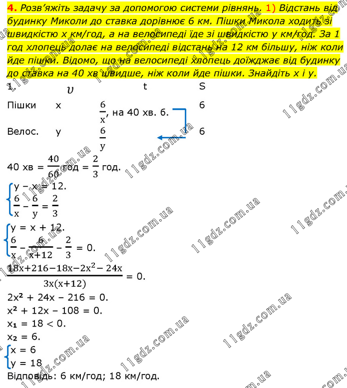 Розв’яжіть задачу за допомогою системи рівнянь. 1) Відстань від будинку Миколи до ставка дорівнює 6 км. Пішки Микола ходить зі швидкістю x км/год, а на велосипеді їде зі швидкістю y км/год. За 1 год хлопець долає на велосипеді відстань на 12 км більшу, ніж коли йде пішки. Відомо, що на велосипеді хлопець доїжджає від будинку до ставка на 40 хв швидше, ніж коли йде пішки. Знайдіть x і y. 40 хв = 40/60 год = 2/3 год. у – х = 12. 6/х – 6/у = 2/3 у = х + 12. 6/х – 6/(х+12) – 2/3 = 0. (18х+216-18х-2х^2- 24х)/(3х(х+12)) = 0. 2х2 + 24х – 216 = 0. х2 + 12х – 108 = 0. х1 = 18 < 0. х2 = 6. х = 6 у = 18 Відповідь: 6 км/год; 18 км/год.