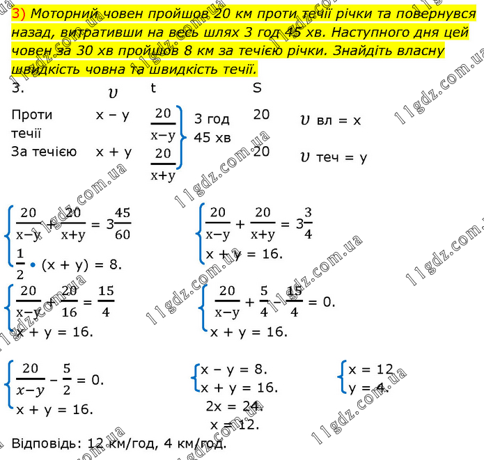 Моторний човен пройшов 20 км проти течії річки та повернувся назад, витративши на весь шлях 3 год 45 хв. Наступного дня цей човен за 30 хв пройшов 8 км за течією річки. Знайдіть власну швидкість човна та швидкість течії. 20/(х-у) + 20/(х+у) = 345/60 1/2 • (х + у) = 8. 20/(х-у) + 20/(х+у) = 33/4 х + у = 16. 20/(х-у) + 20/16 = 15/4 х + у = 16. 20/(х-у) + 5/4 – 15/4 = 0. х + у = 16. 20/(x-y) – 5/2 = 0. x + y = 16. x – y = 8. x + y = 16. 2x = 24. x = 12. x = 12 y = 4. Відповідь: 12 км/год, 4 км/год.