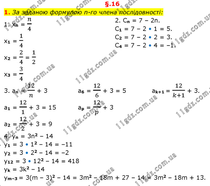 За заданою формулою n-го члена послідовності: 1. xn = n/4 x1 = 1/4 x2 = 2/4 = 1/2 x3 = 3/4 2. Cn = 7 – 2n. C1 = 7 – 2 • 1 = 5. C2 = 7 – 2 • 2 = 3. C4 = 7 – 2 • 4 = –1. 3. an = 12/n + 3 a1 = 12/1 + 3 = 15 a2 = 12/2 + 3 = 9 a6 = 12/6 + 3 = 5 ap = 12/p + 3 ak+1 = 12/(k+1) + 3. 4. yn = 3n2 – 14 y1 = 3 • 12 – 14 = –11 y2 = 3 • 22 – 14 = –2 y12 = 3 • 122 – 14 = 418 yk = 3k2 – 14 ym–3 = 3(m – 3)2 – 14 = 3m2 – 18m + 27 – 14 = 3m2 – 18m + 13.