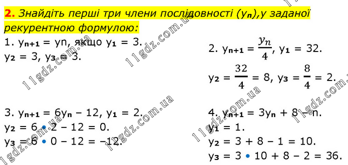 Знайдіть перші три члени послідовності (yn),y заданої рекурентною формулою: 1. yn+1 = yn, якщо у1 = 3. у2 = 3, у3 = 3. 2. yn+1 = y_n/4, y1 = 32. y2 = 32/4 = 8, y3 = 8/4 = 2. 3. yn+1 = 6yn – 12, y1 = 2. y2 = 6 • 2 – 12 = 0. y3 = 6 • 0 – 12 = –12. 4. yn+1 = 3yn + 8 – n. y1 = 1. y2 = 3 + 8 – 1 = 10. y3 = 3 • 10 + 8 – 2 = 36.