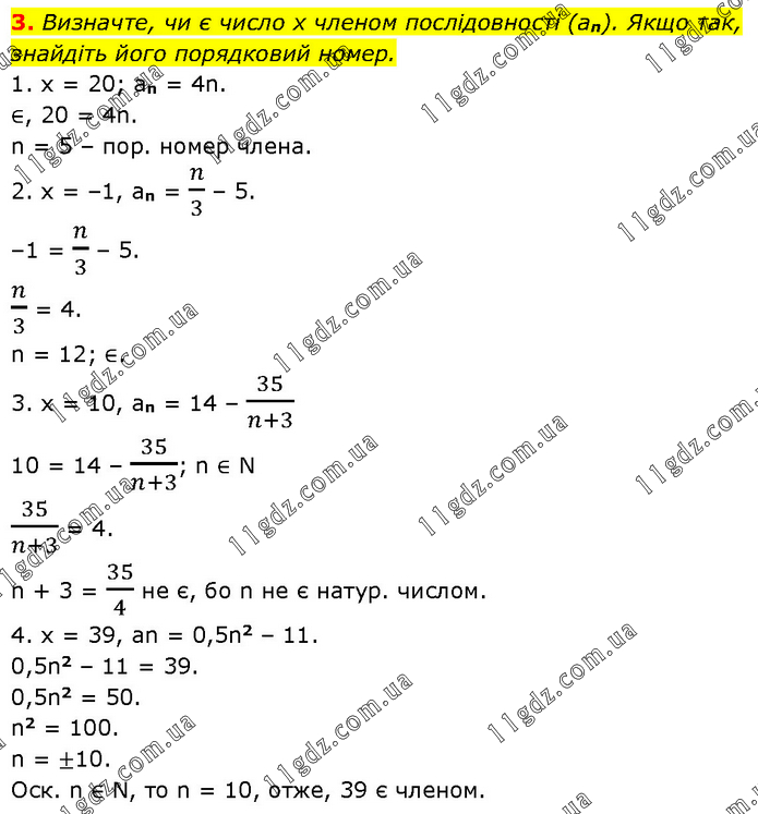 Визначте, чи є число x членом послідовності (an). Якщо так, знайдіть його порядковий номер. 1. x = 20; an = 4n. ∈, 20 = 4n. n = 5 – пор. номер члена. 2. x = –1, an = n/3 – 5. –1 = n/3 – 5. n/3 = 4. n = 12; ∈. 3. x = 10, an = 14 – 35/(n+3) 10 = 14 – 35/(n+3); n ∈ N 35/(n+3) = 4. n + 3 = 35/4 не є, бо n не є натур. числом. 4. x = 39, an = 0,5n2 – 11. 0,5n2 – 11 = 39. 0,5n2 = 50. n2 = 100. n = ±10. Оск. n ∈ N, то n = 10, отже, 39 є членом.