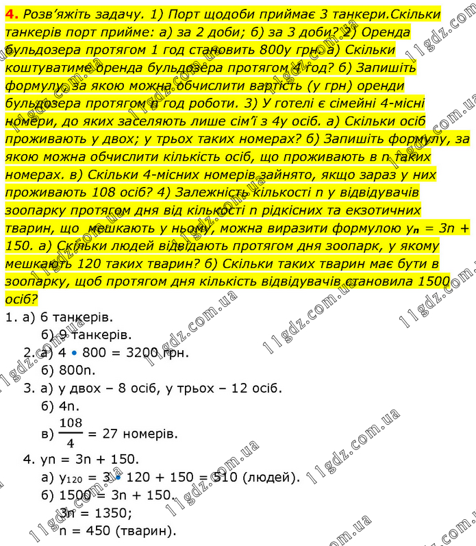 Розв’яжіть задачу. 1) Порт щодоби приймає 3 танкери.Скільки танкерів порт прийме: а) за 2 доби; б) за 3 доби? 2) Оренда бульдозера протягом 1 год становить 800y грн. а) Скільки коштуватиме оренда бульдозера протягом 4 год? б) Запишіть формулу, за якою можна обчислити вартість (у грн) оренди бульдозера протягом n год роботи. 3) У готелі є сімейні 4-місні номери, до яких заселяють лише сім’ї з 4y осіб. а) Скільки осіб проживають у двох; y трьох таких номерах? б) Запишіть формулу, за якою можна обчислити кількість осіб, що проживають в n таких номерах. в) Скільки 4-місних номерів зайнято, якщо зараз у них проживають 108 осіб? 4) Залежність кількості n y відвідувачів зоопарку протягом дня від кількості n рідкісних та екзотичних тварин, що мешкають y ньому, можна виразити формулою yn = 3n + 150. а) Скільки людей відвідають протягом дня зоопарк, у якому мешкають 120 таких тварин? б) Скільки таких тварин має бути в зоопарку, щоб протягом дня кількість відвідувачів становила 1500 осіб? 1. а) 6 танкерів. б) 9 танкерів. 2. а) 4 • 800 = 3200 грн. б) 800n. 3. а) у двох – 8 осіб, у трьох – 12 осіб. б) 4n. в) 108/4 = 27 номерів. 4. yn = 3n + 150. a) y120 = 3 • 120 + 150 = 510 (людей). б) 1500 = 3n + 150. 3n = 1350; n = 450 (тварин).