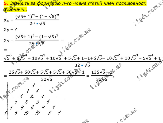 Знайдіть за формулою n-го члена п’ятий член послідовності Фібоначчі. Хn = ((√5+ 1)^n- (1- √5 )^n)/(2^n • √5) X5 – ? X5 = ((√5+ 1)^5- (1- √5 )^5)/(2^n • √5) = = (〖√5〗^5+ 5〖√5〗^4+ 10〖√5〗^3+ 10〖√5〗^2+ 5√5+ 1-1+5√5- 10〖√5〗^2+ 10〖√5〗^3- 5〖√5〗^4+ 1)/(32 • √5) = (25√5+ 50√5+ 5√5+ 5√5+ 50√5+ 1)/(32√5) = (135√5+ 1)/(32√5).
