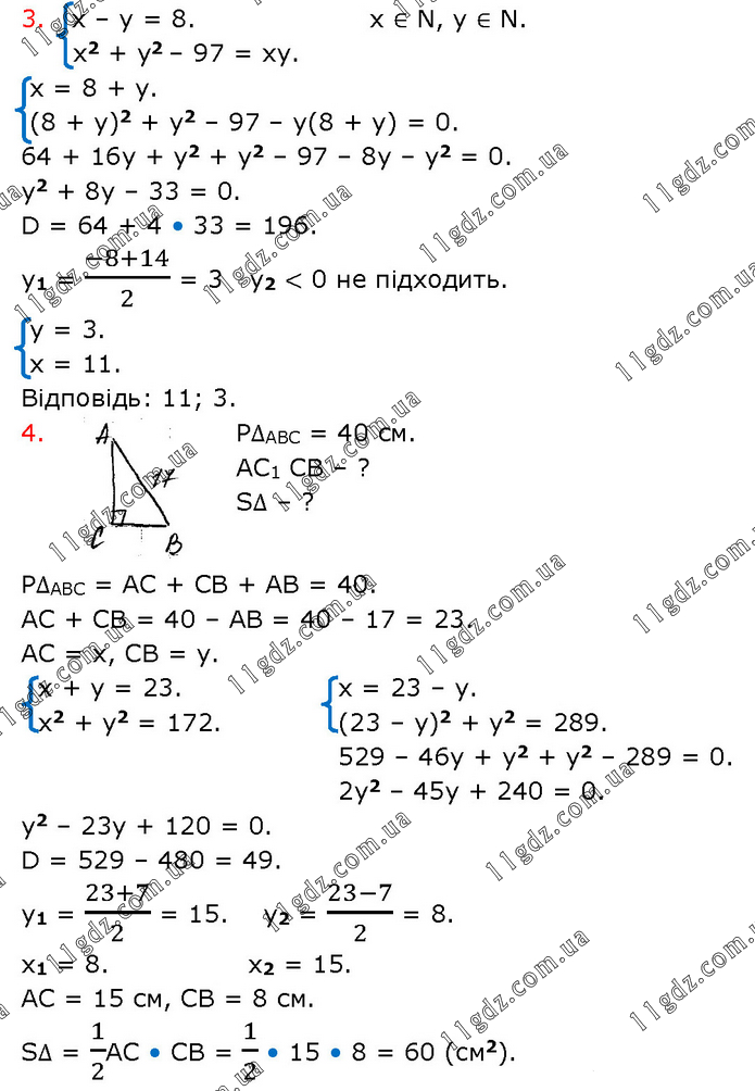 х – у = 8. х ∈ N, y ∈ N. x2 + y2 – 97 = xy. x = 8 + y. (8 + y)2 + y2 – 97 – y(8 + y) = 0. 64 + 16y + y2 + y2 – 97 – 8y – y2 = 0. y2 + 8y – 33 = 0. D = 64 + 4 • 33 = 196. y1 = (-8+14)/2 = 3 y2 < 0 не підходить. у = 3. х = 11. Відповідь: 11; 3. 4. Р∆АВС = 40 см. АС1 СВ – ? S∆ – ? Р∆АВС = AC + CB + AB = 40. AC + CB = 40 – AB = 40 – 17 = 23. AC = x, CB = y. x + y = 23. x2 + y2 = 172. x = 23 – y. (23 – y)2 + y2 = 289. 529 – 46y + y2 + y2 – 289 = 0. 2y2 – 45y + 240 = 0. y2 – 23y + 120 = 0. D = 529 – 480 = 49. y1 = (23+7)/2 = 15. y2 = (23-7)/2 = 8. x1 = 8. x2 = 15. AC = 15 см, СВ = 8 см. S∆ = 1/2AC • CB = 1/2 • 15 • 8 = 60 (cм2).