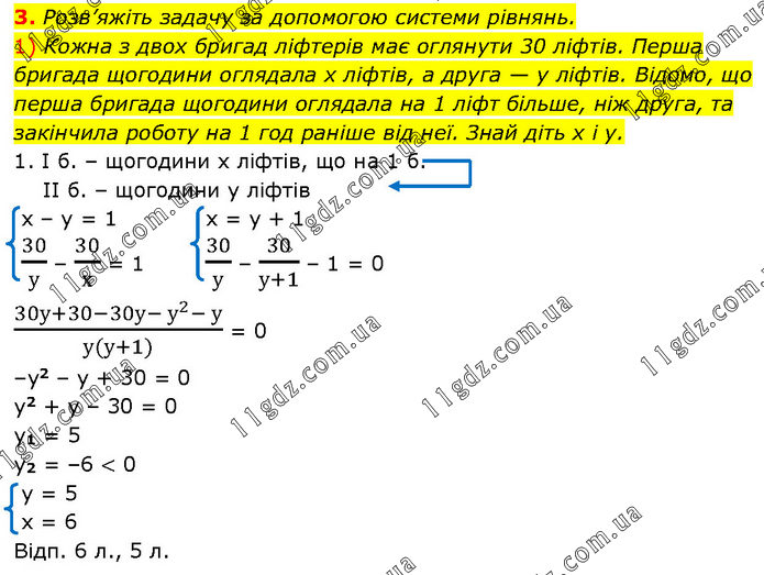 Розв’яжіть задачу за допомогою системи рівнянь. 1) Кожна з двох бригад ліфтерів має оглянути 30 ліфтів. Перша бригада щогодини оглядала x ліфтів, а друга — y ліфтів. Відомо, що перша бригада щогодини оглядала на 1 ліфт більше, ніж друга, та закінчила роботу на 1 год раніше від неї. Знай діть x і y. 1. І б. – щогодини х ліфтів, що на 1 б. ІІ б. – щогодини у ліфтів х – у = 1 30/у – 30/х = 1 х = у + 1 30/у – 30/(у+1) – 1 = 0 (30у+30-30у- у^2- у)/(у(у+1)) = 0 –у2 – у + 30 = 0 у2 + у – 30 = 0 у1 = 5 у2 = –6 < 0 у = 5 х = 6 Відп. 6 л., 5 л.