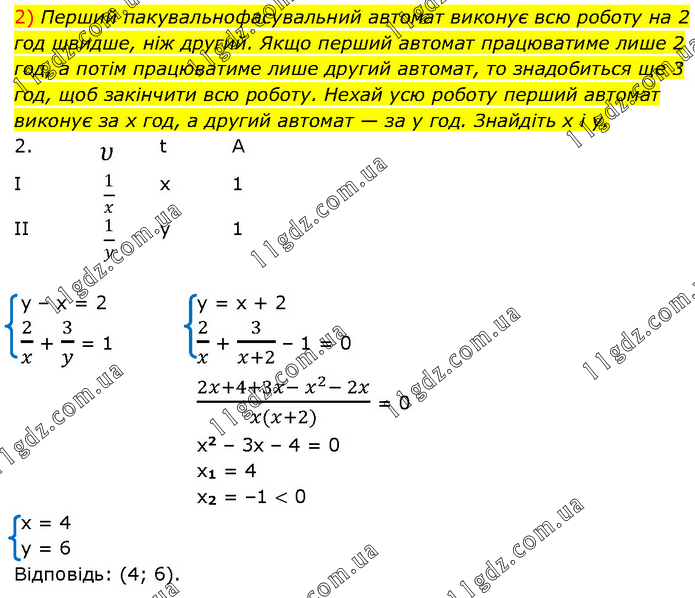 Перший пакувальнофасувальний автомат виконує всю роботу на 2 год швидше, ніж другий. Якщо перший автомат працюватиме лише 2 год, а потім працюватиме лише другий автомат, то знадобиться ще 3 год, щоб закінчити всю роботу. Нехай усю роботу перший автомат виконує за x год, а другий автомат — за y год. Знайдіть x і y. 2. υ t A I 1/x x 1 II 1/y y 1 y – x = 2 2/x + 3/y = 1 y = x + 2 2/x + 3/(x+2) – 1 = 0 (2x+4+3x- x^2- 2x)/(x(x+2)) = 0 x2 – 3x – 4 = 0 x1 = 4 x2 = –1 < 0 x = 4 y = 6 Відповідь: (4; 6).