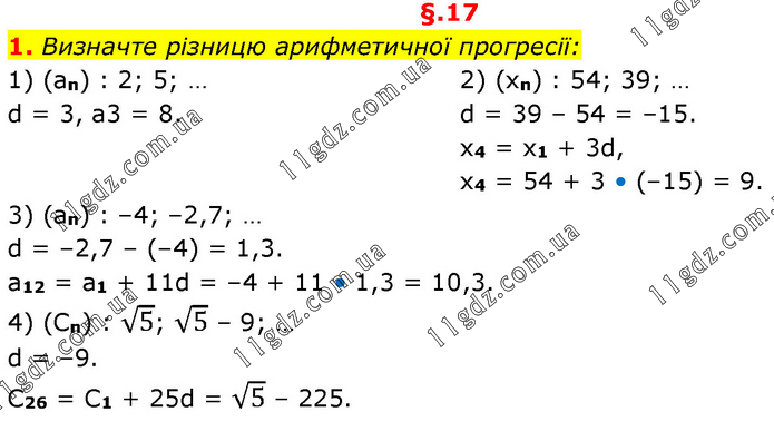Визначте різницю арифметичної прогресії: 1) (an) : 2; 5; … d = 3, a3 = 8. 2) (xn) : 54; 39; … d = 39 – 54 = –15. x4 = x1 + 3d, x4 = 54 + 3 • (–15) = 9. 3) (an) : –4; –2,7; … d = –2,7 – (–4) = 1,3. a12 = a1 + 11d = –4 + 11 • 1,3 = 10,3. 4) (Cn) : √5; √5 – 9; … d = –9. C26 = C1 + 25d = √5 – 225.