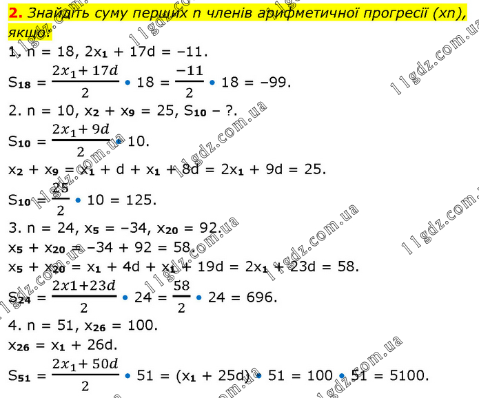 Знайдіть суму перших n членів арифметичної прогресії (xn), якщо: 1. n = 18, 2x1 + 17d = –11. S18 = (2x_1+ 17d)/2 • 18 = (-11)/2 • 18 = –99. 2. n = 10, x2 + x9 = 25, S10 – ?. S10 = (2x_1+ 9d)/2 • 10. x2 + x9 = x1 + d + x1 + 8d = 2x1 + 9d = 25. S10 = 25/2 • 10 = 125. 3. n = 24, x5 = –34, x20 = 92. x5 + x20 = –34 + 92 = 58. x5 + x20 = x1 + 4d + x1 + 19d = 2x1 + 23d = 58. S24 = (2x1+23d)/2 • 24 = 58/2 • 24 = 696. 4. n = 51, x26 = 100. x26 = x1 + 26d. S51 = (2x_1+ 50d)/2 • 51 = (x1 + 25d) • 51 = 100 • 51 = 5100.