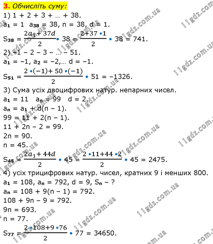 Обчисліть суму: 1) 1 + 2 + 3 + … + 38. a1 = 1 a38 = 38, n = 38, d = 1. S38 = (2a_1+ 37d)/2• 38 = (2+37 •1)/2 • 38 = 741. 2) –1 – 2 – 3 – … – 51. a1 = –1, a2 = –2,… d = –1. S51 = (2 •(-1)+ 50 •(-1))/2 • 51 = –1326. 3) Сума усіх двоцифрових натур. непарних чисел. a1 = 11 an = 99 d = 2. an = a1 + d(n – 1). 99 = 11 + 2(n – 1). 11 + 2n – 2 = 99. 2n = 90. n = 45. S45 = (2a_1+ 44d)/2 • 45 = (2 •11+44 •2)/2 • 45 = 2475. 4) усіх трицифрових натур. чисел, кратних 9 і менших 800. а1 = 108, an = 792, d = 9, Sn – ? an = 108 + 9(n – 1) = 792. 108 + 9n – 9 = 792. 9n = 693. n = 77. S77 = (2 •108+9 •76)/2 • 77 = 34650.