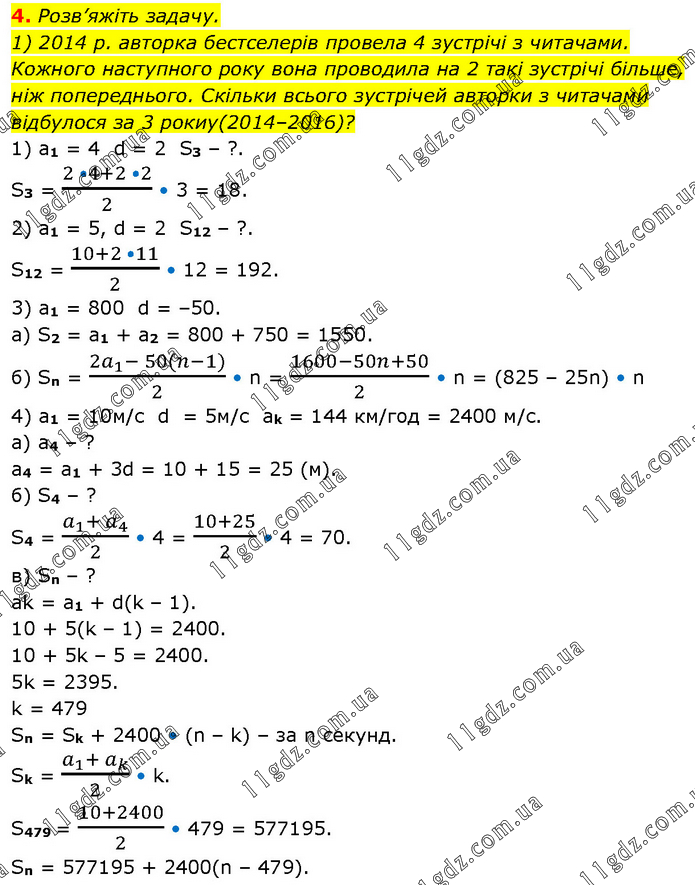Розв’яжіть задачу. 1) 2014 р. авторка бестселерів провела 4 зустрічі з читачами. Кожного наступного року вона проводила на 2 такі зустрічі більше, ніж попереднього. Скільки всього зустрічей авторки з читачами відбулося за 3 рокиy(2014–2016)? 1) a1 = 4 d = 2 S3 – ?. S3 = (2 •4+2 •2)/2 • 3 = 18. 2) a1 = 5, d = 2 S12 – ?. S12 = (10+2 •11)/2 • 12 = 192. 3) a1 = 800 d = –50. a) S2 = a1 + a2 = 800 + 750 = 1550. б) Sn = (2a_1- 50(n-1))/2 • n = (1600-50n+50)/2 • n = (825 – 25n) • n 4) a1 = 10м/с d = 5м/с ak = 144 км/год = 2400 м/с. а) а4 – ? а4 = а1 + 3d = 10 + 15 = 25 (м). б) S4 – ? S4 = (a_1+ a_4)/2 • 4 = (10+25)/2 • 4 = 70. в) Sn – ? ak = a1 + d(k – 1). 10 + 5(k – 1) = 2400. 10 + 5k – 5 = 2400. 5k = 2395. k = 479 Sn = Sk + 2400 • (n – k) – за n секунд. Sk = (a_1+ a_k)/2 • k. S479 = (10+2400)/2 • 479 = 577195. Sn = 577195 + 2400(n – 479).