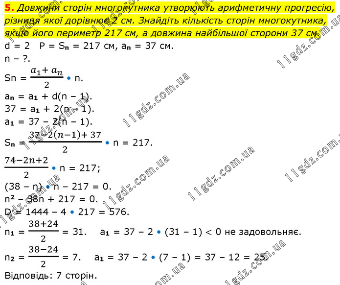 Довжини сторін многокутника утворюють арифметичну прогресію, різниця якої дорівнює 2 см. Знайдіть кількість сторін многокутника, якщо його периметр 217 см, а довжина найбільшої сторони 37 см. d = 2 P = Sn = 217 см, an = 37 cм. n – ?. Sn = (a_1+ a_n)/2 • n. an = a1 + d(n – 1). 37 = a1 + 2(n – 1). a1 = 37 – 2(n – 1). Sn = (37-2(n-1)+ 37)/2 • n = 217. (74-2n+2)/2 • n = 217; (38 – n) • n – 217 = 0. n2 – 38n + 217 = 0. D = 1444 – 4 • 217 = 576. n1 = (38+24)/2 = 31. a1 = 37 – 2 • (31 – 1) < 0 не задовольняє. n2 = (38-24)/2 = 7. a1 = 37 – 2 • (7 – 1) = 37 – 12 = 25. Відповідь: 7 сторін.