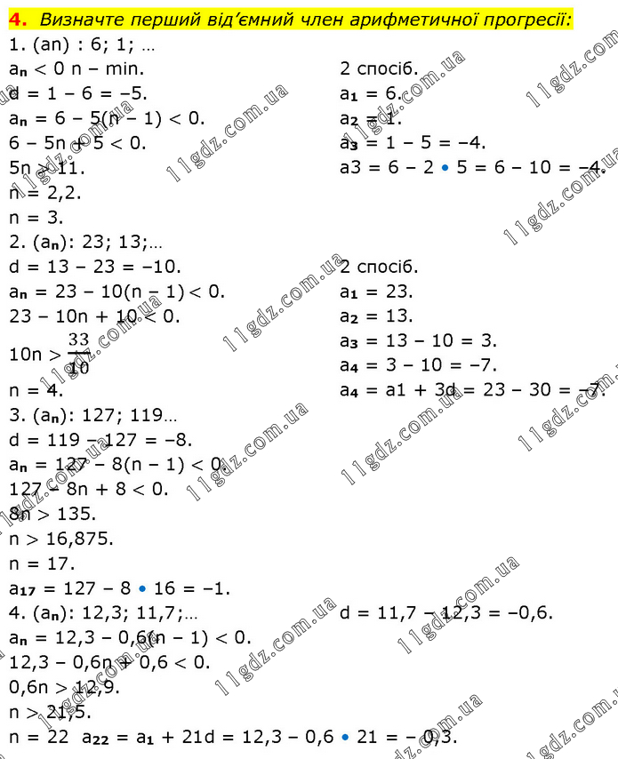 Визначте перший від’ємний член арифметичної прогресії: 1. (an) : 6; 1; … an < 0 n – min. d = 1 – 6 = –5. an = 6 – 5(n – 1) < 0. 6 – 5n + 5 < 0. 5n > 11. n = 2,2. n = 3. 2 спосіб. а1 = 6. а2 = 1. а3 = 1 – 5 = –4. a3 = 6 – 2 • 5 = 6 – 10 = –4. 2. (an): 23; 13;… d = 13 – 23 = –10. an = 23 – 10(n – 1) < 0. 23 – 10n + 10 < 0. 10n > 33/10 n = 4. 2 спосіб. a1 = 23. a2 = 13. a3 = 13 – 10 = 3. a4 = 3 – 10 = –7. a4 = a1 + 3d = 23 – 30 = –7. 3. (an): 127; 119… d = 119 – 127 = –8. an = 127 – 8(n – 1) < 0. 127 – 8n + 8 < 0. 8n > 135. n > 16,875. n = 17. a17 = 127 – 8 • 16 = –1. 4. (an): 12,3; 11,7;… an = 12,3 – 0,6(n – 1) < 0. 12,3 – 0,6n + 0,6 < 0. 0,6n > 12,9. n > 21,5. d = 11,7 – 12,3 = –0,6. n = 22 a22 = a1 + 21d = 12,3 – 0,6 • 21 = – 0,3.