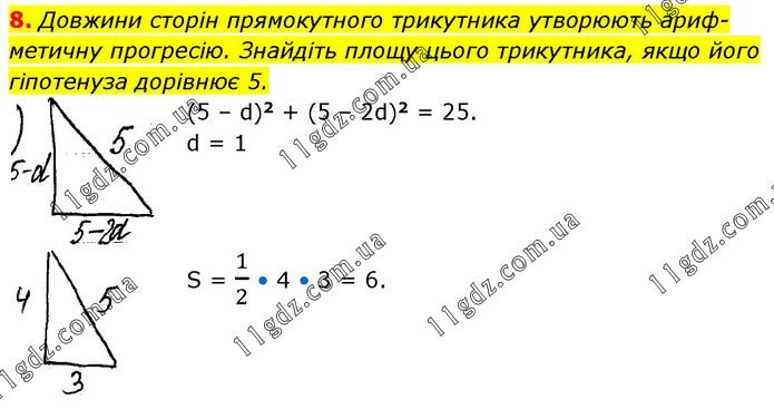 Довжини сторін прямокутного трикутника утворюють ариф-метичну прогресію. Знайдіть площу цього трикутника, якщо його гіпотенуза дорівнює 5. (5 – d)2 + (5 – 2d)2 = 25. d = 1 S = 1/2 • 4 • 3 = 6.