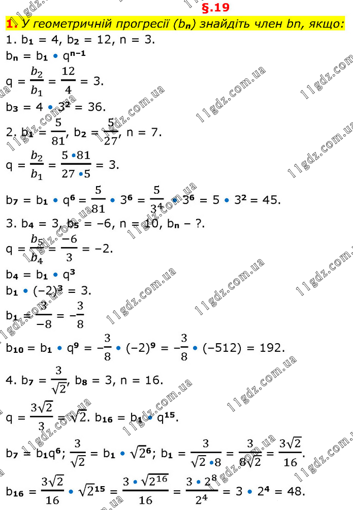 У геометричній прогресії (bn) знайдіть член bn, якщо: 1. b1 = 4, b2 = 12, n = 3. bn = b1 • qn–1 q = b_2/b_1 = 12/4 = 3. b3 = 4 • 32 = 36. 2. b1 = 5/81, b2 = 5/27, n = 7. q = b_2/b_1 = (5 •81)/(27 •5) = 3. b7 = b1 • q6 = 5/81 • 36 = 5/3^4 • 36 = 5 • 32 = 45. 3. b4 = 3, b5 = –6, n = 10, bn – ?. q = b_5/b_4 = (-6)/3 = –2. b4 = b1 • q3 b1 • (–2)3 = 3. b1 = 3/(-8) = –3/8 b10 = b1 • q9 = –3/8 • (–2)9 = –3/8 • (–512) = 192. 4. b7 = 3/√2, b8 = 3, n = 16. q = (3√2)/3 = √2. b16 = b1 • q15. b7 = b1q6; 3/√2 = b1 • √26; b1 = 3/(√2 •8) = 3/(8√2) = (3√2)/16. b16 = (3√2)/16 • √215 = (3 • √(2^16 ))/16 = (3 • 2^8)/2^4 = 3 • 24 = 48.