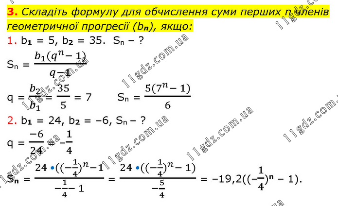 Складіть формулу для обчислення суми перших n членів геометричної прогресії (bn), якщо: 1. b1 = 5, b2 = 35. Sn – ? Sn = (b_1 (q^n- 1))/(q-1) q = b_2/b_1 = 35/5 = 7 Sn = (5(7^n- 1))/6 2. b1 = 24, b2 = –6, Sn – ? q = (-6)/24 = –1/4 Sn = (24 •((-1/4 )^n-1)/(-1/4- 1) = (24 •((-1/4 )^n- 1))/(-5/4) = –19,2((–1/4)n – 1).